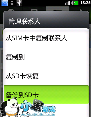二:并在弹出的列表中选择“备份到SD卡”项,将所有联系人导出到SD卡中进行备份。