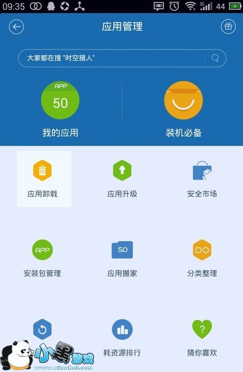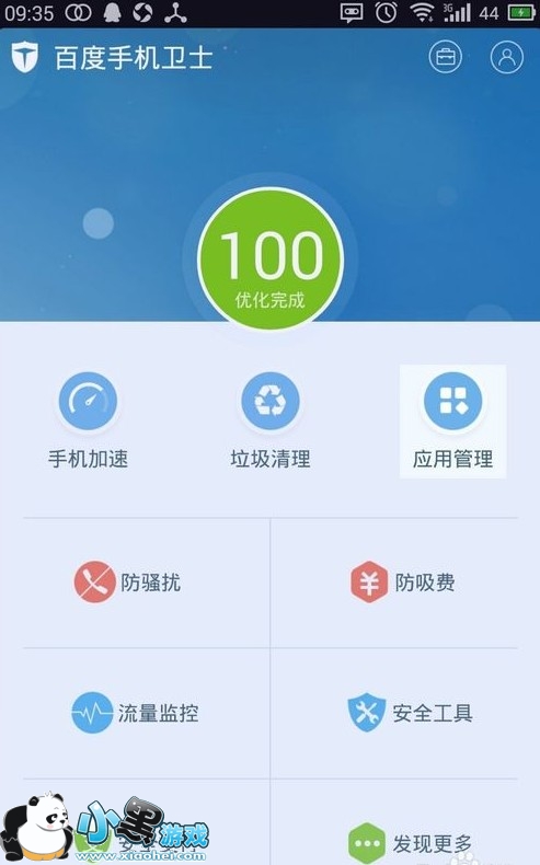 安装百度手机卫士,并打开,如果提示需要ROOT权限,则授权。点击“应用管理”,如图: