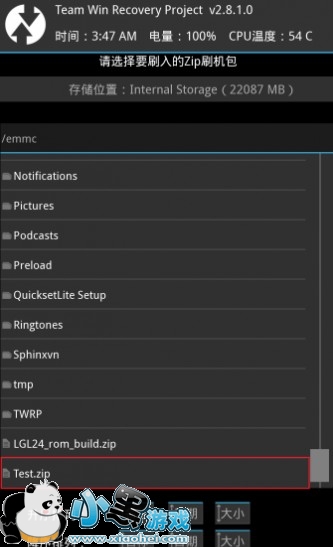 3,然后找到/sdcard下想要刷的ZIP格式的supersu卡刷包(例如Test.zip),然后点这个卡刷包。