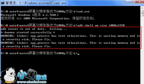 2.然后手机链接电脑,下载adb工具解压点击【运行.bat】,输入代码:adb shell wm size 1080x1920,按回车Enter(结果如下图红框所示,前两行可以没有),然后重启note4即可。