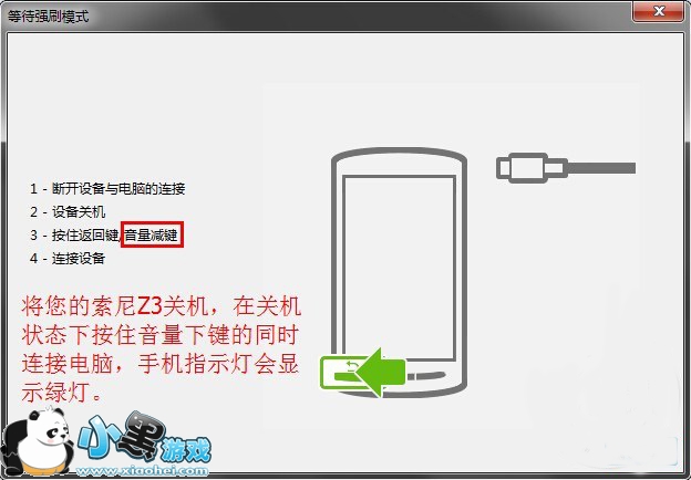 7、此时强刷工具准备就绪,等待手机连接;我们将手机关机,在关机状态下按住【音量下键】通过USB数据线连接电脑(台式机连接主机箱后面的USB接口)。