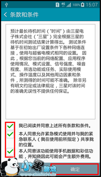5、点击超级省电模式右侧滑块,在阅读“条款和条件”后,勾选所有复选框,然后点击确定。