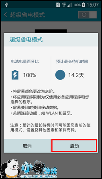 6、阅读超级省电模式注意后,点击启动