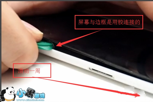 2、由于屏幕与机身是用胶连接在一起的,所以使用拨片从边角处滑动一周就可以将屏幕与机身分离。需要注意的拨片不能插得太深,以免伤及内部排线或者其他零件