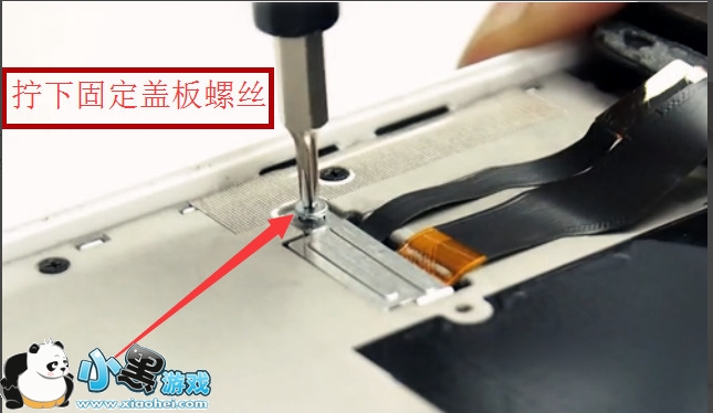 4、当屏幕与机身分离后你会看到排线所在的地方,用螺丝刀拧下螺丝,用镊子取下排线固定盖片,并将取下来的零件分类放好。具体操作如图所示。