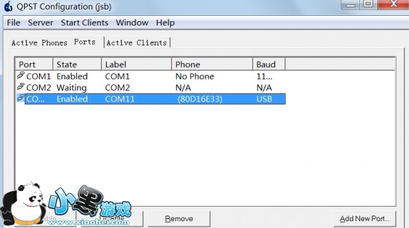 现在打开QPST Configuration,点右下角add new port,在Port后面输入你的设备管理器窗口中显示的端口值,比如我上面的就是COM11,输入COM11然后OK,就能看到新添加的端口,如下图: