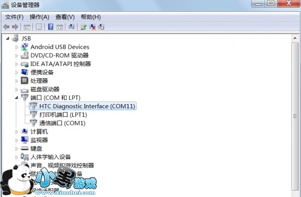 然后usb线连接手机和电脑,在电脑上进入设备管理器窗口(右击我的电脑——属性——设备管理器)看看有没有出现如下图的显示内容(HTC diagnosticinterface (COM11)中的COM11各人会有所不同,11代表我现在使用的是端口11,后面需要用到这个数值)。