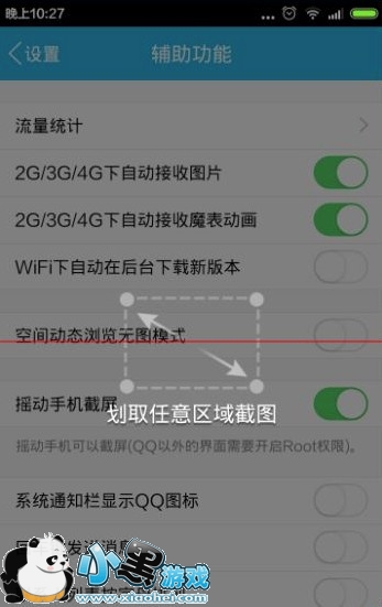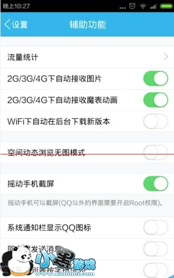 7、接下来返回到QQ界面,在设置选项里开启摇动手机截屏功能,如下图所示。