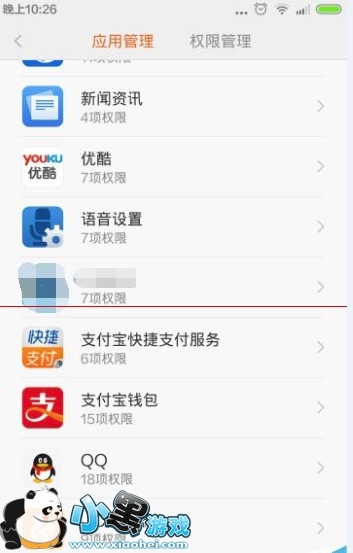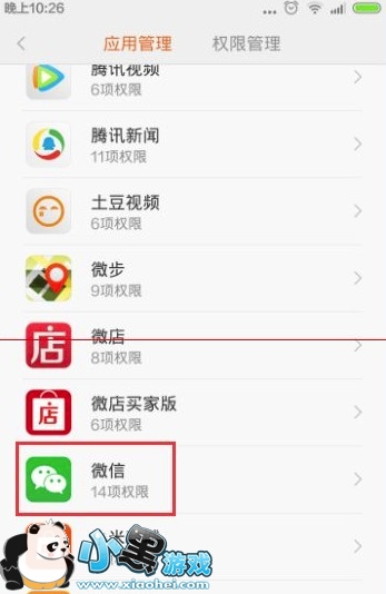 4、点击【应用权限管理】选项,在该选项界面里可以看到【微信】,【QQ】等应用程序,如下图所示。
