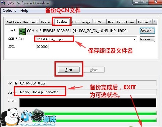 7、开启另一个功能窗口,其他不用管,选择Backup选项卡进行QCN备份,保存路径和文件名可自定义,start开始备份,出现提示且EXIT为可选状态,备份完成。