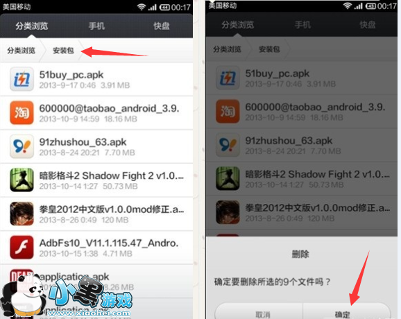 2、进入分类浏览后,可以看到手机的音乐、视频、图片、安装包等文件占用系统的详细情况,安装包属于我们已经安装过过的应用安装文件,装好软件之后就没有必要留着了,选中之后删除,以节省小米手机内存空间。