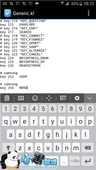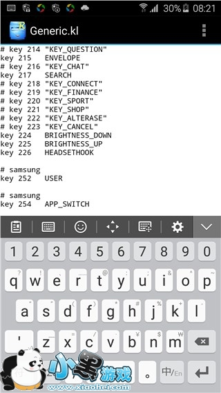 第二步:用R.E管理器进入system/usr/keylayout,把上面的挂载改为写,进入目录后把Generic.kl用编辑器方式打开,找到:key 254 APP_SWITCH,改为:key 254 MENU,保存退出即可。