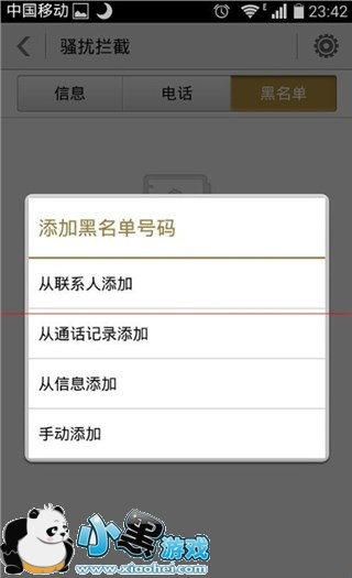 3、切换到“黑名单”按钮下,点击“添加黑名单号码”进行号码添加,跳出四个选项对话框,这里我们根据自己需要进行设置。