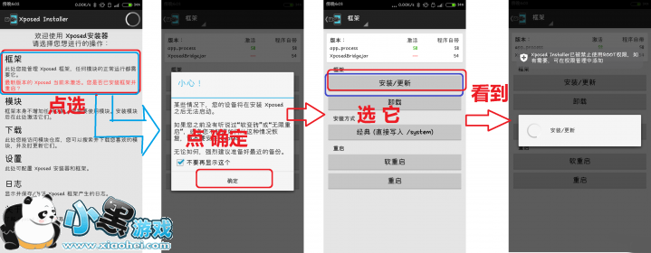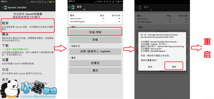 这一步也很简单,回到Xposed主界面,在“框架”选项上选择“更新/安装”,再在弹出窗口里选择“确定”即可,等待重启二十几秒即可。此时,你可以尝试打开你的QQ、你的微信、你的微博、你的所有软件,你会发现,奇迹诞生了!