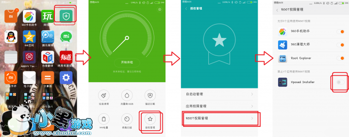 (4)然后退出回到桌面,进入“安全中心”→→进入右下角“授权管理”→→点选Xposed那一栏的开关,通过五个5秒钟的关卡(点选“下一步”),即可完成Root的全过程。