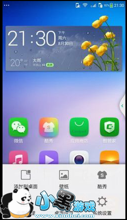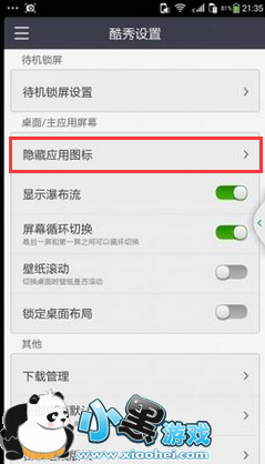 在弹出菜单中点“酷秀设置”就会看到”隐藏应用图标“的选项,不过在默认的单层桌面下不能使用,要用的话就要切换到经典桌面。