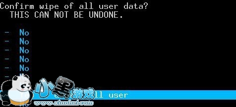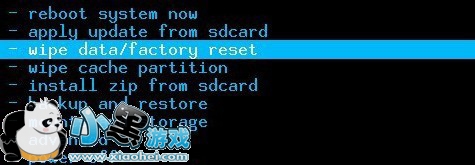 4、选择wipe data/factory reset(中文版的是:清空所有数据,就是手机设置里的恢复出厂设置选项),然后按开机键确认,再选择【yes - delete all data】(是的 - 清空所有数据)即可