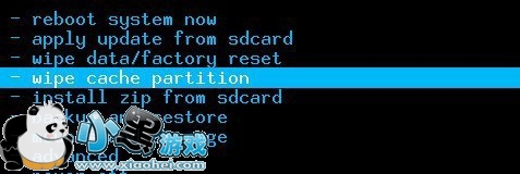 5、选择wipe cache partition(中文版的是:清空缓存),然后按开机键确认,再选择【yes - wipe cache】(是的 - 清空所有缓存)即可