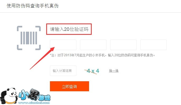 4、刮开小米4包装盒背面的防伪图层,会看到有20位防伪码。这里,只需要将这20位防伪码输入查询页面的文本框中,点击“立即查询”,就可以知道你所买的小米4的真伪了。