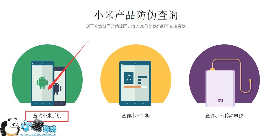 3、在“商品防伪查询”页面,我们可以看到有小米手机、小米平板和小米电源三种产品的真伪查询,选择你想要查询的产品类别就可以了。这里,我们选择的是“查询小米手机”