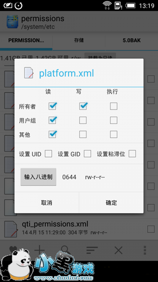 使用r.e管理器,进入/system/etc/permissions目录,拷贝platform.xml到外置卡上自建备份目录里面。