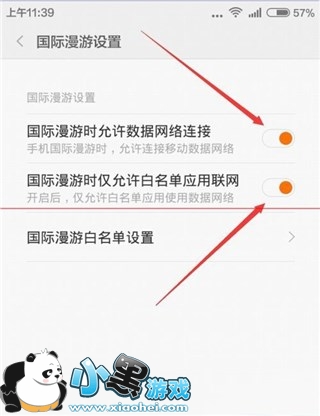4、点击“国际漫游时允许数据网络连接”后面的开关,打开该功能,同时打开“国际漫游时仅允许白名单应用联网”功能。设置完成后点击下面的“国际漫游白名单”菜单项