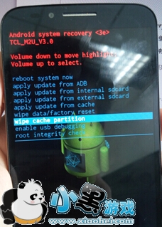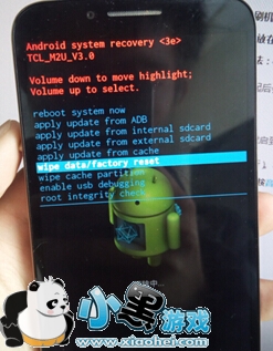 3. 进行双清操作,wipe data/factory reset(进入之后选择YES)和wipe cache partition(按音量下键进行选择,按音量上键确定操作)。