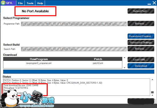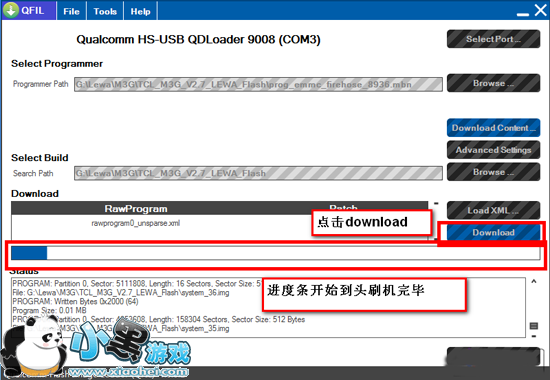 6 开始刷机。选择Download按钮,此时软件开始加载文件,一会后进度条开始走动。