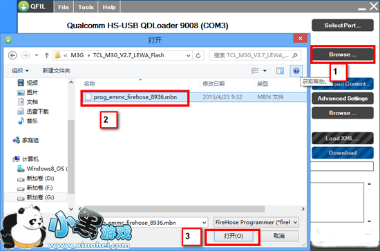 4 选择刷机文件。打开QPST中的QFIL,点击Browser,在弹出的对话框中选择线刷包的目录中的mbn文件并打开。