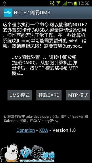 首先需要安装NOTE2 简易UMS这个小程序(点击下载),安装后打开界面如图。当然前提是手机必须获取了Root权限和正确安装BUSYBOX。相关机型Root教程可以在小黑市场玩机专区找到。