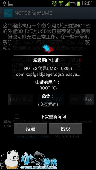手机用USB连接电脑。打开程序后,点击UMS模式按钮,会弹出ROOT授权窗口,授权后就打开USB大容量存储模式了。