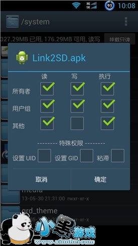 把需要转换的应用(apk文件)连同刚拖出的.so文件(如果有),放到手机内存卡,再用RE管理器复制到system目录,把权限更改如图,再把更改权限后的apk文件移动到system/app目录,.so文件移动到system/lib目录。完成后重启手机,应用就转换成系统程序了。