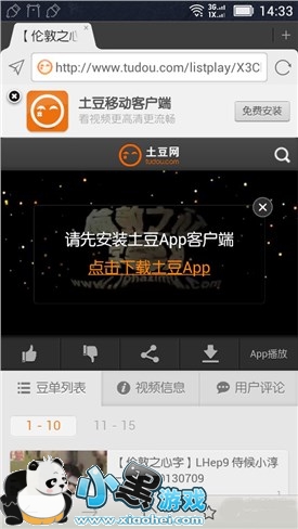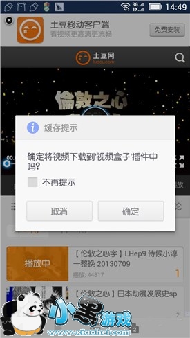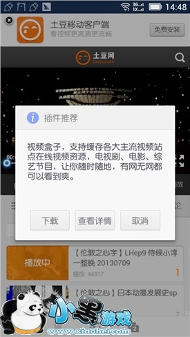 我们再试试同样的方法土豆网行不行,还是用傲游浏览器,点下载图标,这次不行了,要求安装土豆APP客户端,当然安装土豆客户端后再进行下载也是一个方法。但如果不想安装客户端呢?我们用UC浏览器试试,相信这个浏览器用户还是比较多的。用UC打开后,同样点下载图标,这时弹出个视频盒子的插件推荐,我们点下载,下载完成后安装这个插件,然后再回到刚才下载视频的页面:
