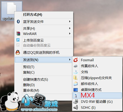 3.在电脑上直接鼠标右键update.zip/update.bin文件发送到“MX4”(同理,对应机型会出现相应显示)即可。