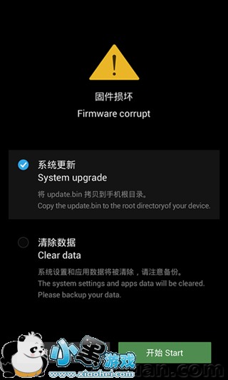 如果您在更新过程中很不幸的看到下图界面,可能是update.zip/update.bin文件在下载过程中出现损坏。