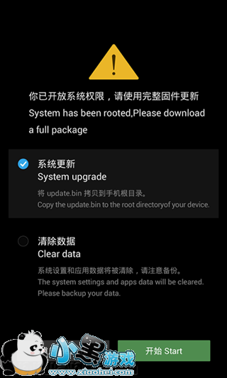 开放系统权限后的手机只能通过完整固件包升级,如果强行通过OTA接收推送升级的,会在升级过程中提示: