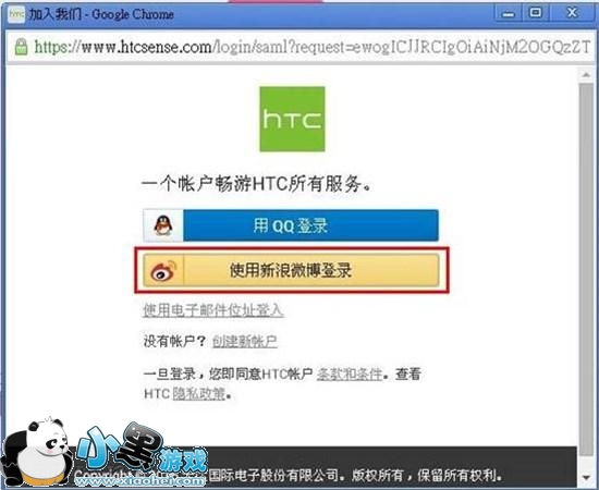 点击后会弹出对话框,提示您登录HTC账户。建议您使用微博账户登录。