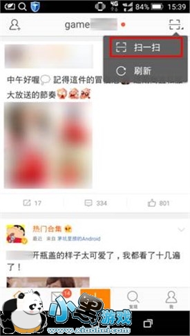 进入手机上的微博软件,点击首页界面右上角的扫描图标。在下拉菜单中点击扫一扫。