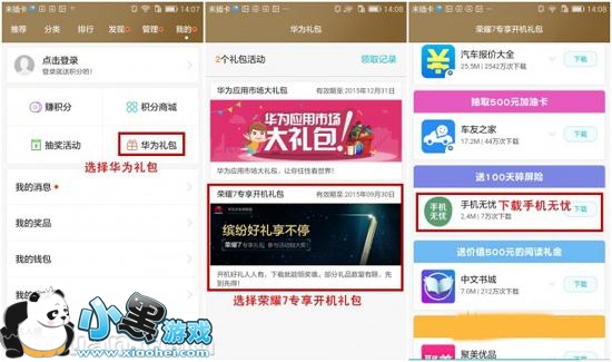 第二步:点击“华为礼包”,选择第二项荣耀7专享开机礼包找到“手机无忧”并下载