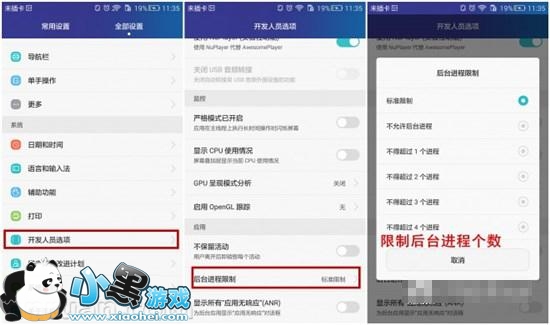 打开开发人员选项(相信大家都知道开启方法),找到倒数第二项“后台进程限制”,根据你的需求设置限制,全方位限制后台的运行,进一步降低手机耗能。