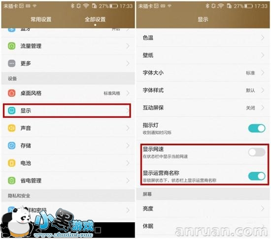 在设置里进行“显示”设置,可以这是隐藏运营商图标,或者开启显示当前网速。