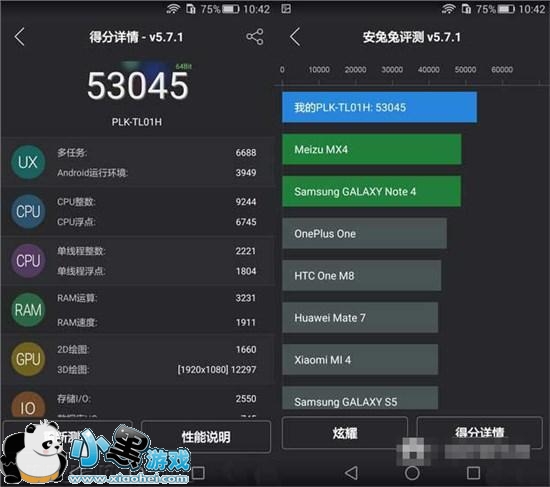 荣耀7拥有一块5.2英寸1920*1080分辨率屏幕,内置64位八核麒麟935处理器,主频2.2GHz,并拥有3GB RAM+16GB/64GB ROM的存储组合。拍照方面是800万像素前置+2000万像素后置的组合,配备前置LED补光灯。预装基于Android 5.0的EMUI 3.1,支持指纹识别,电池容量3100毫安时。配置可以说相当之强悍!这一点从跑分就可以看出!