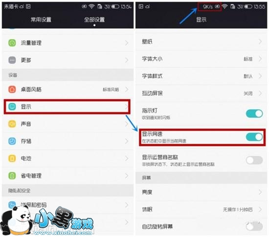 打开设置,选择“显示”,可以开启“显示网速”功能,此时状态栏会显示小7的实时网速。