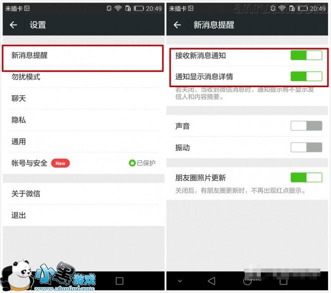 一、在微信的设置里有个新消息提醒,进入之后需要打开“接受新消息通知”和“通知显示消息详情”两项。