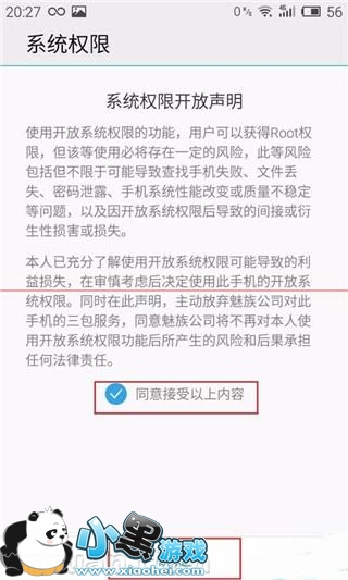5、勾选【同意...】,点击【确定】。手机会自动ROOT并重启。重启完后ROOT成功。