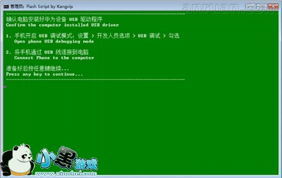 1、首先确保手机已经正确安装驱动并且已经打开USB调试并且能够正确连接到电脑。在如下窗口按下任意键继续。