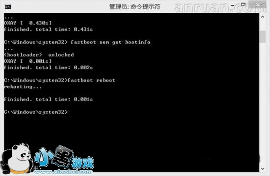 输入 fastboot oem get-bootinfo,提示,unlocked,说明已经解锁成功,这样我们就可以换REC,然后刷第三方ROM了。