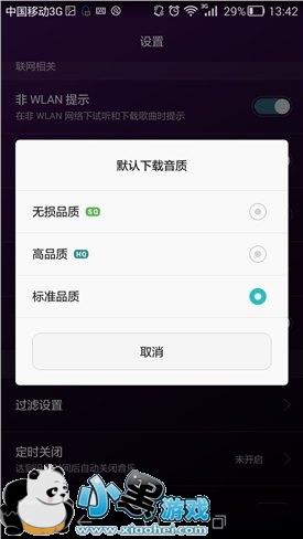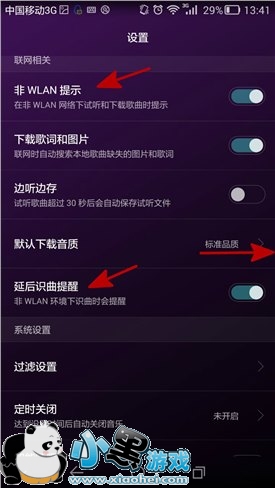 关于联网方面的设置:数据业务下听歌会产生流量费,重点是流量跑的还很快。所以设置一个在非WLAN状态下的提醒还是很重要的,在我的音乐界面--设置按钮,建议开启非WLAN提示和延后识曲提醒。当然,对于音乐品质较高的朋友来说,可以自行设置默认下载音质。