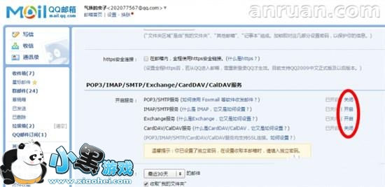 2、选择账户那一联,下拉就可以看到”POP3/IMAP/SMTP/Exchange/CardDAV/CalDAV服务"把需要开启的打开即可。