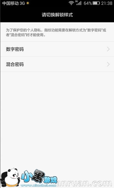 3、如果你曾经没有设置过解锁数字密码或者解锁混合密码(可以含字母等),那么系统就会提示你设置两种密码类型的一种。(修改指纹是需要解锁密码的,不然谁都可以设置了)